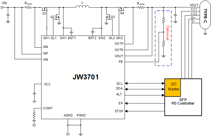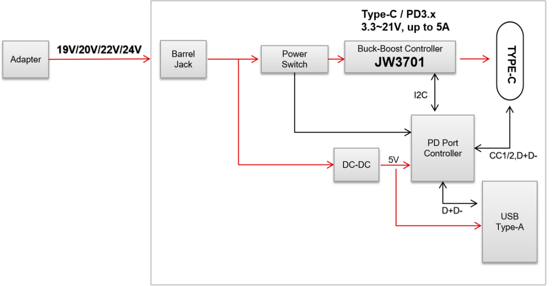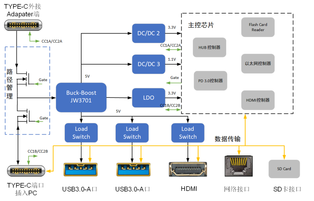在拓展坞应用中,JW3701作为前级DC/DC控制器,可接受宽范围输入电压,并为USB口、HDMI等多种接口以及主控芯片提供稳定供电。其可编程的过流、过压、过温保护机制全面保障系统安全,而通过I²C控制的输出调压与限流功能,则有效减少了外部元器件数量,降低了布板复杂度与整体成本。