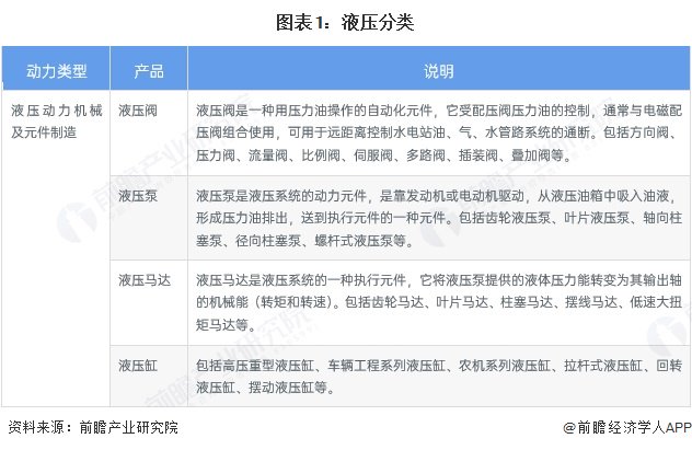 液压动力机械按照产品功能区分可以分为液压阀、液压泵、液压马达和液压缸。