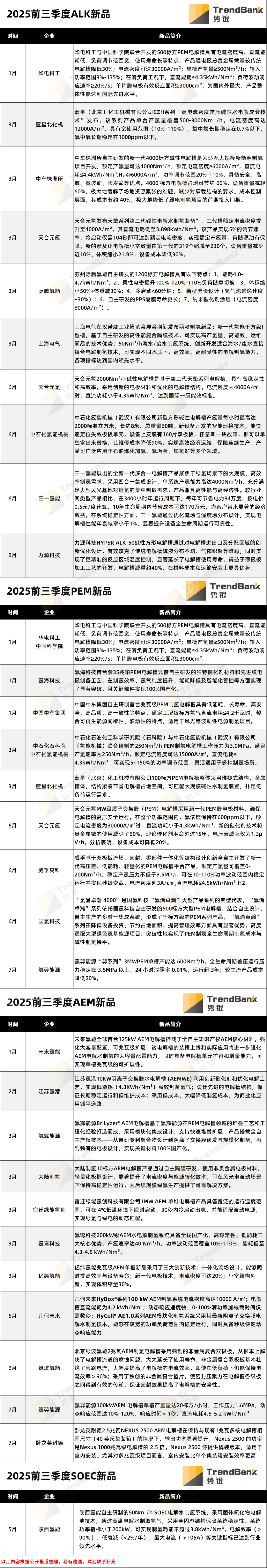 其中,中石化氢能机械、蓝星北化机、华电科工、天合元氢、氢羿能源等5家企业在2025年都发布了两种路线的电解水制氢装备新品。