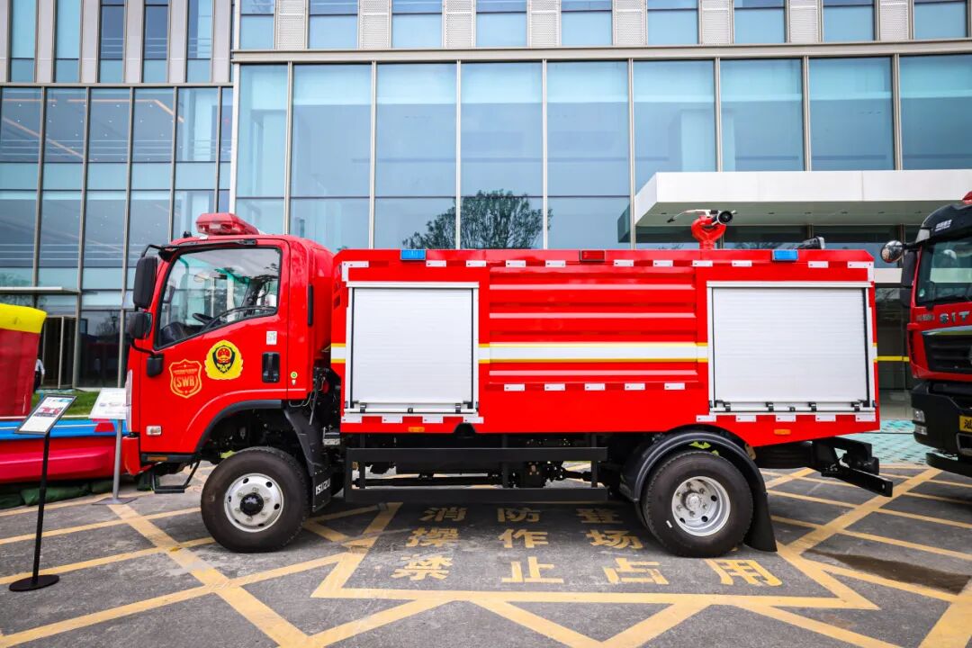 针对森林、高原等特殊灭火场景,山河智能展出的SW580101森林消防水车更显“专业适配性”。该车整机重量9100KG,搭载110kW大功率发动机,为高海拔、长距离作业提供持续动力;车辆爬坡度超40%,最高车速达90km/h,可快速穿梭于山地密林、高原荒坡;灭火效能方面,配备大流量消防泵与消防炮,能持续压制大面积森林火情。