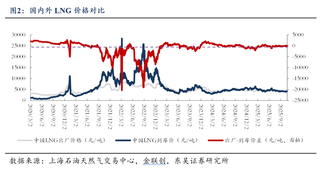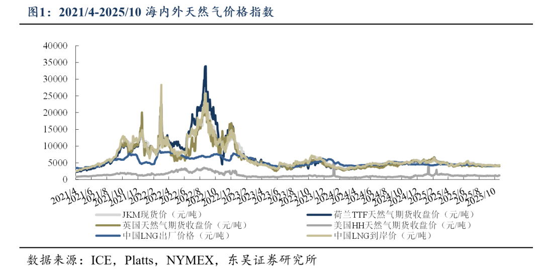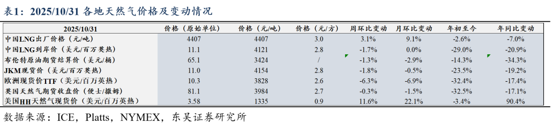 截至2025/10/31,美国HH/欧洲TTF/东亚JKM/中国LNG出厂/中国LNG到岸价周环比变动+11.6%/-6.3%/-1.8%/+3.1%/-1.7%至0.9/2.6/2.8/3/2.8元/方,海内外倒挂结束。
