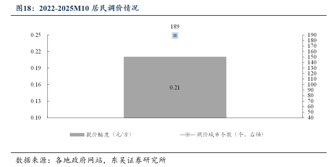 2022~2025M10,全国65%(189个)地级及以上城市进行了居民顺价,提价幅度为0.21元/方。2024年龙头城燃公司价差在0.53~0.54元/方,2025H1普遍修复0.01元/方,结合我们此前在报告《对比海外案例,国内顺价政策合理、价差待提升》中的测算,城燃配气费合理值在0.6元/方以上,价差仍存10%修复空间,顺价仍将继续落地。