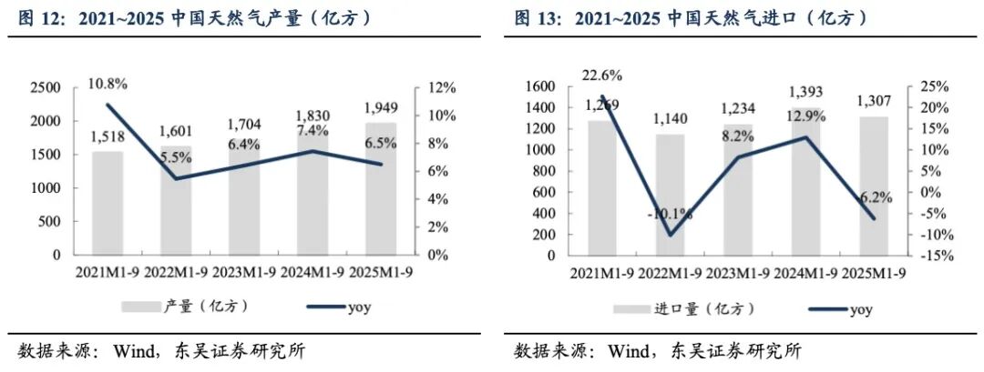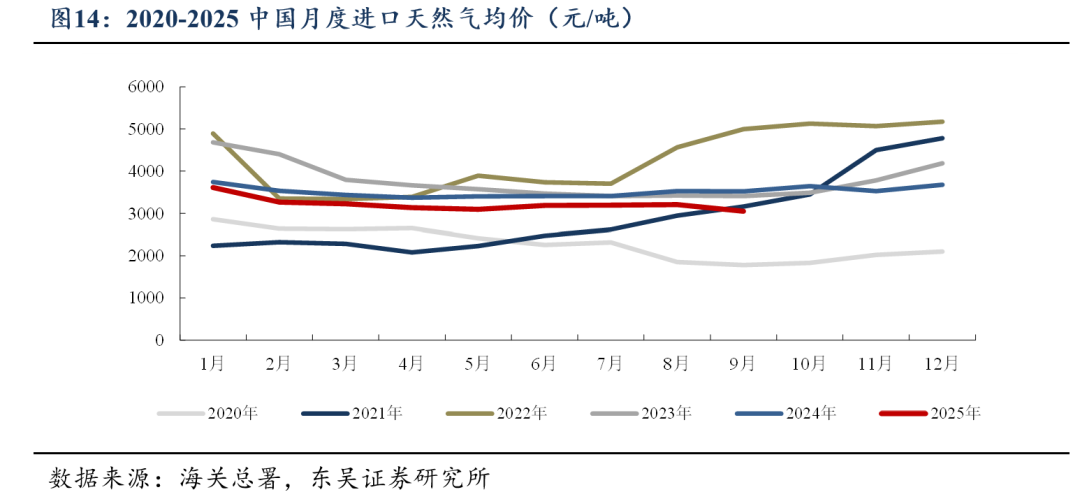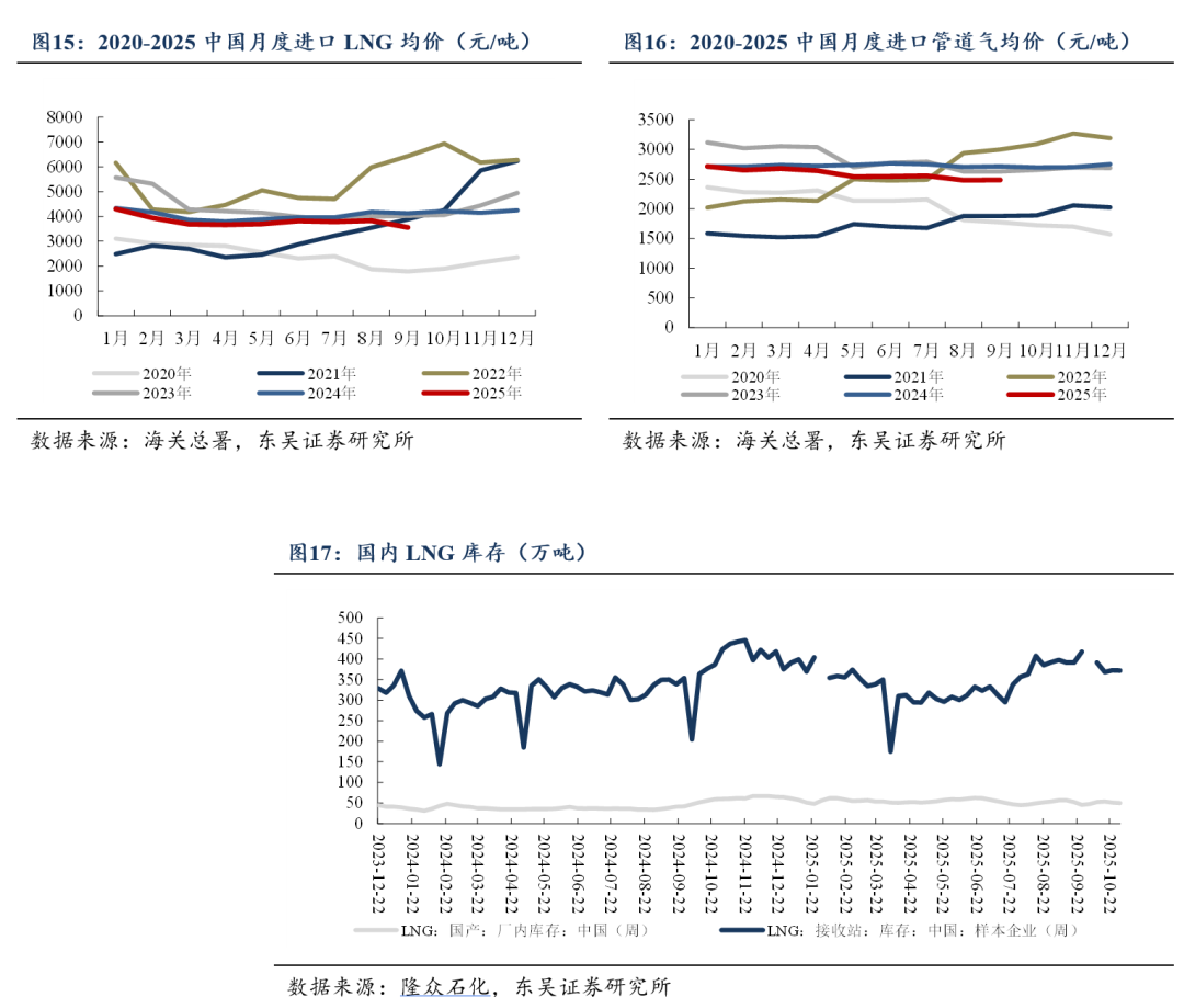 降温提振补库需求,国内气价周环比+3.1%。2025M1-9,我国天然气表观消费量同比+0.7%至3188亿方,原因或为2024年冬季偏暖,影响了2025M1-3采暖用气需求。2025M1-9,产量同比+6.5%至1949亿方,进口量同比-6.2%至1307亿方。2025年9月,国内液态天然气进口均价3560元/吨,环比-6.9%,同比-13.6%;国内气态天然气进口均价2490元/吨,环比+0.3%,同比-8.4%;天然气整体进口均价3047元/吨,环比-4.9%,同比-13.4%。截至2025/10/31,国内进口接收站库存372.1万吨,同比-12.08%,周环比-0.03%;国内LNG厂内库存49.85万吨,同比-16.01%,周环比-1.64%。