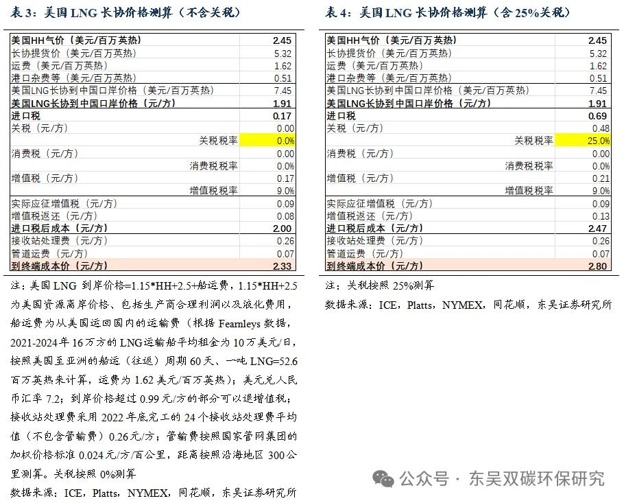 参考入库报告《自2/10起对美LNG加征15%关税,美LNG进口占比有限,加关税后仍具成本优势》,2024年美国LNG长协到达沿海地区终端用户的成本叠加25%关税将达2.80元/方,在沿海地区仍具0.08~0.55元/方的价格优势,价格优势显现。2024年中国自美国进口LNG约416万吨,占LNG进口总量约5.4%,占全国表观消费量约1.4%;占比较小,对整体供给影响有限。