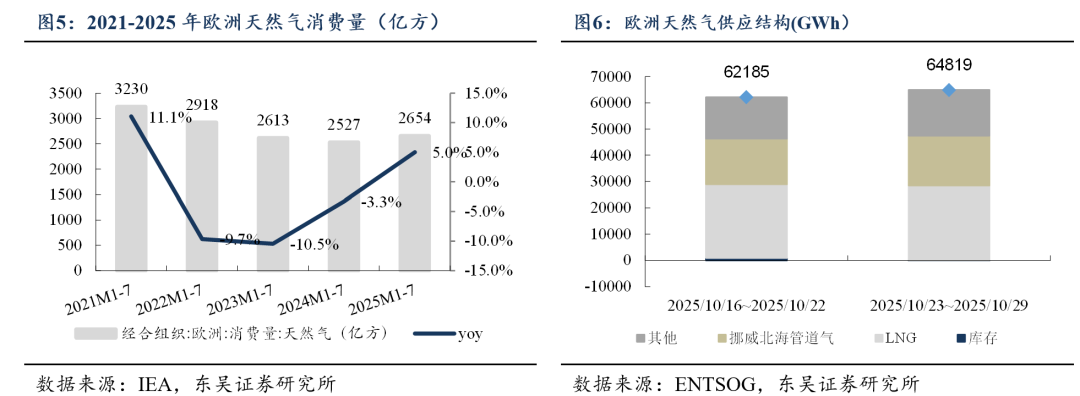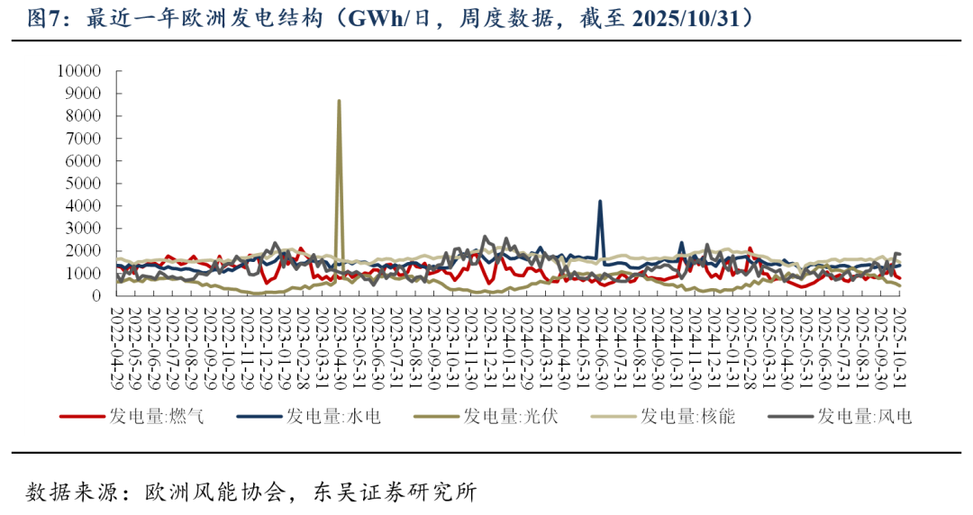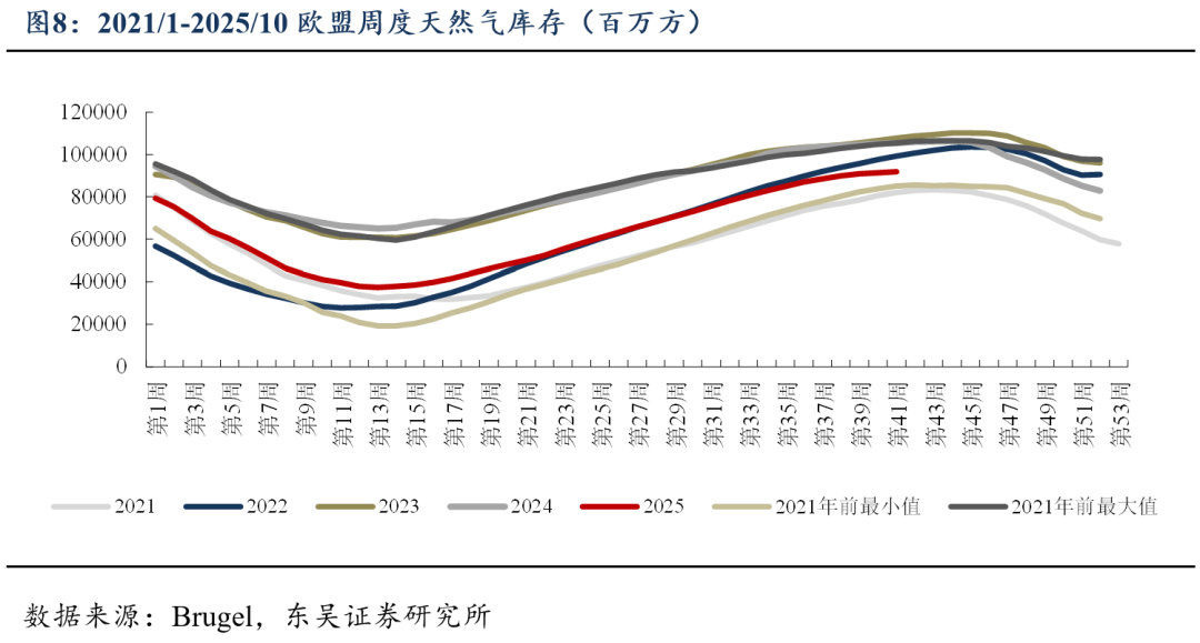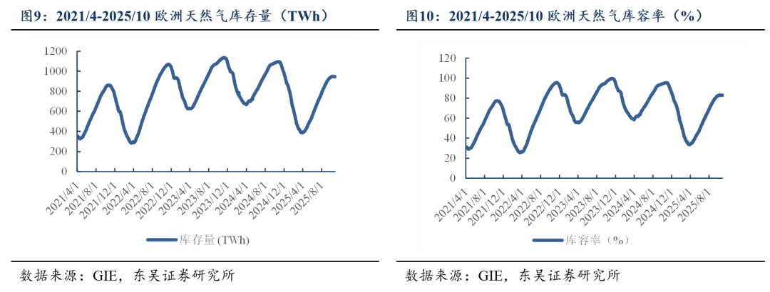 燃气发电出力下降,欧洲气价周环比-6.3%。2025M1-7,欧洲天然气消费量为2654亿方,同比+5%。2025/10/23~2025/10/29,欧洲天然气供给周环比+4.2%至64819GWh;其中,来自库存消耗-123GWh,周环比+113.7%;来自LNG接收站28397GWh,周环比+1.4%;来自挪威北海管道气19031GWh,周环比+9.5%。2025/10/25~2025/10/31,欧洲燃气发电出力下降、水电出力上升,欧洲日平均燃气发电量周环比-7%、同比-5.1%至829.3GWh。截至2025/10/29,欧洲天然气库存945TWh(913亿方),同比-147.5TWh;库容率82.79%,同比-12.4pct,周环比0pct。
