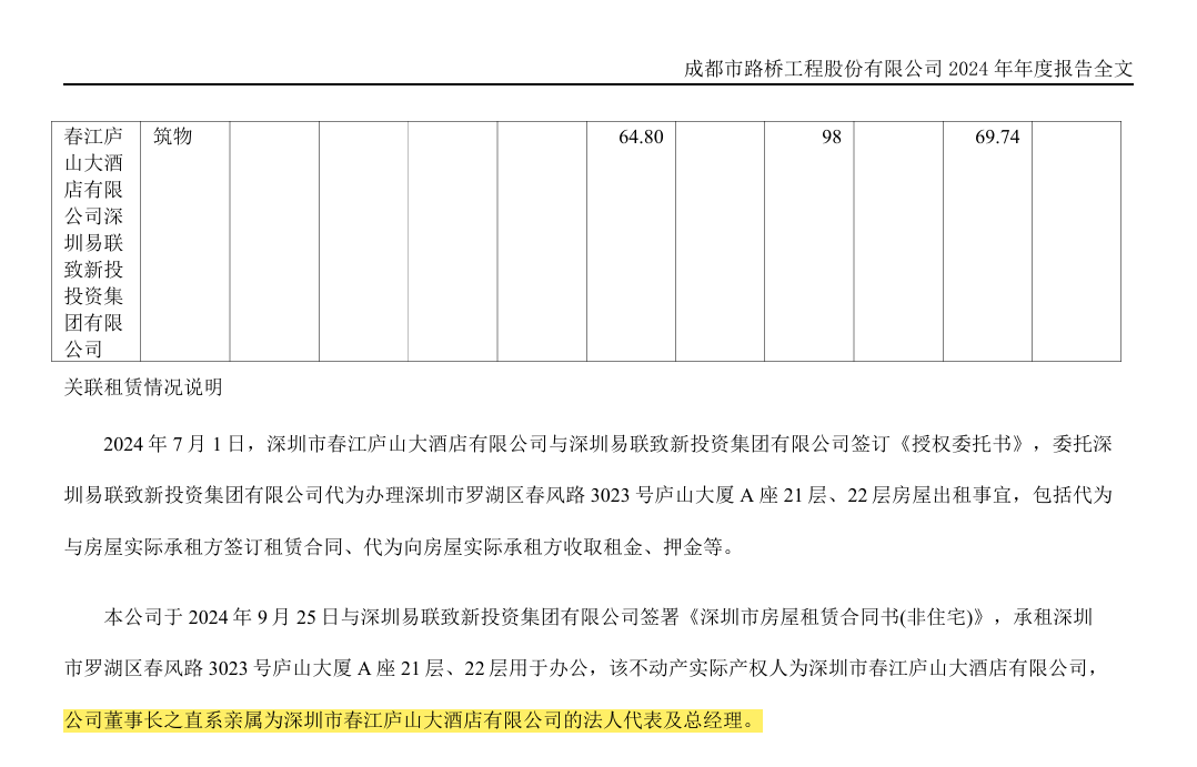本公司于2024年9月25日与深圳易联致新投资集团有限公司签署《深圳市房屋租赁合同书(非住宅)》,承租深圳市罗湖区春风路3023号庐山大厦A座21层、22层用于办公,该不动产实际产权人为深圳市春江庐山大酒店有限公司,公司董事长之直系亲属为深圳市春江庐山大酒店有限公司的法人代表及总经理。