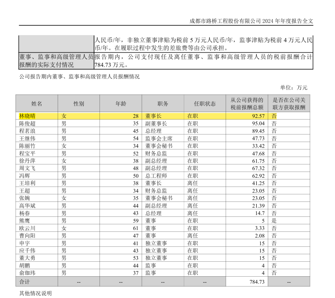 29岁的林晓晴,继续当成都路桥这家上市公司的董事长,年薪92.57万。
