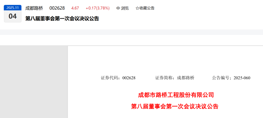 成都市路桥工程股份有限公司(以下简称“公司”)第八届董事会第一次会议于2025年11月3日以现场表决与通讯表决相结合的方式召开,会议通知于2025年11月3日以口头通知、电话通知的方式发出。本次会议应参加表决董事9名,实际参加表决董事9名。全体与会董事推举董事林晓晴女士主持本次会议,林晓晴女士对本次会议的通知时间等事项向与会董事作出说明。本次会议的召集、召开程序符合《中华人民共和国公司法》及《公司章程》的规定。