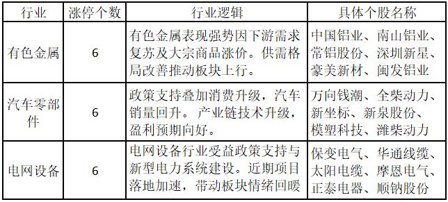从行业特征来看,今日涨停板个股中,有色金属、汽车零部件、电网设备这三个行业的个股最多。