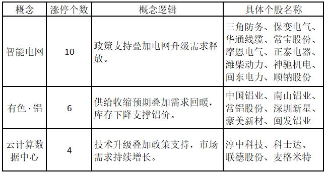 从概念特征来看,今日涨停板个股中,智能电网、有色·铝、云计算数据中心这三个概念的个股最多。