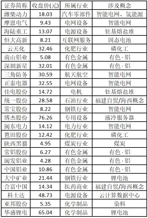 涨停板个股中,股价创出近一年新高的个股有24只(不包括创出历史新高的个股),包括潍柴动力、摩恩电气、海陆重工、恒大高新、云天化、南山铝业、深圳新星、三角防务、正泰电器、佳电股份、统一股份、常宝股份、博杰股份、闽东电力、芭田股份、陕西黑猫、常铝股份、闽发铝业、中国铝业、大中矿业、合富中国、科士达、亚邦股份、华盛锂电,具体如下表所示。
