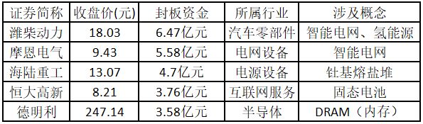 从封板资金来看,今日涨停板个股中,封板资金排名前5的个股包括潍柴动力、摩恩电气、海陆重工、恒大高新、德明利。欢迎大家关注微信公众号“道达号”,其“道达涨停复盘”栏目为大家解读。
