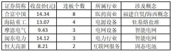 从连板情况来看,今日首板个股有51只;2连板的个股有7只;3连板及以上的个股有4只。今日连板数排名前5的个股包括合富中国、海陆重工、摩恩电气、闽东电力、恒大高新,具体如下表所示。