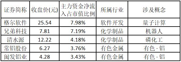 主力资金净流入金额占市值比例排名前5的个股分别为格尔软件、兄弟科技、清水源、常铝股份、闽发铝业。