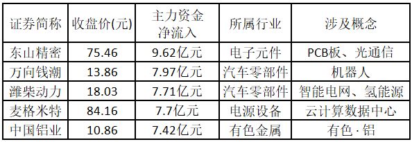 从主力资金来看,今日涨停板个股中,主力资金净流入金额排名前5的个股分别为东山精密、万向钱潮、潍柴动力、麦格米特、中国铝业。
