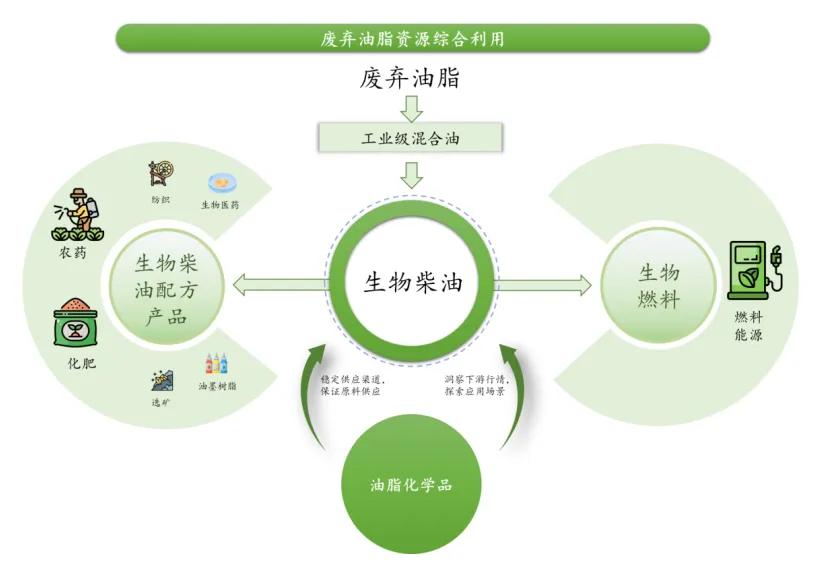 基于长期的研发投入和产业实践,公司不断拓展废弃油脂资源综合利用的深度与广度,成功构建起一条“废弃油脂—生物燃料—生物基材料”的完整循环产业链。同时,公司在核心技术上持续深耕,通过自主研发实现了对更广泛来源废弃油脂的充分利用,并借助工艺创新,成功提取提纯其中的可酯化物。