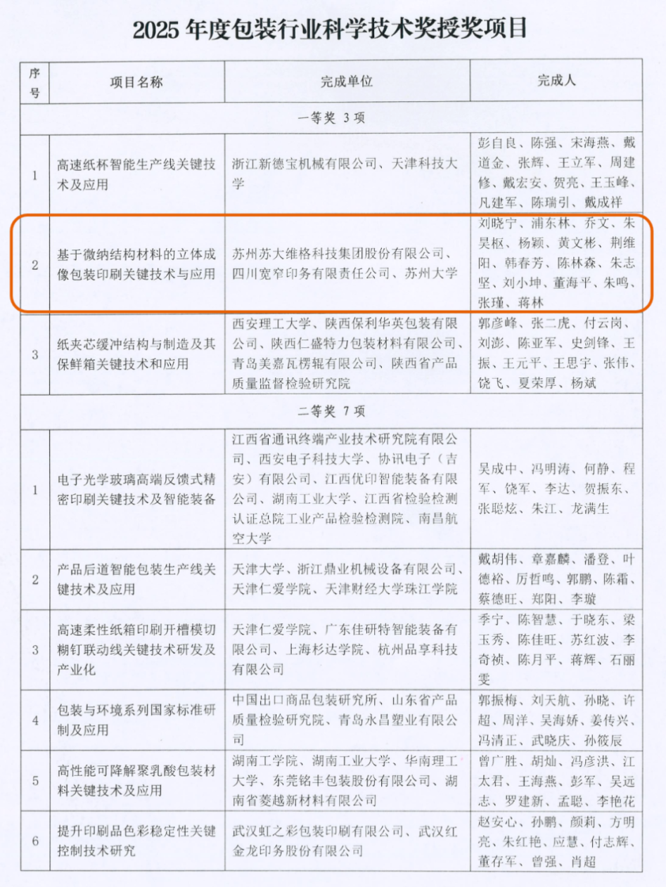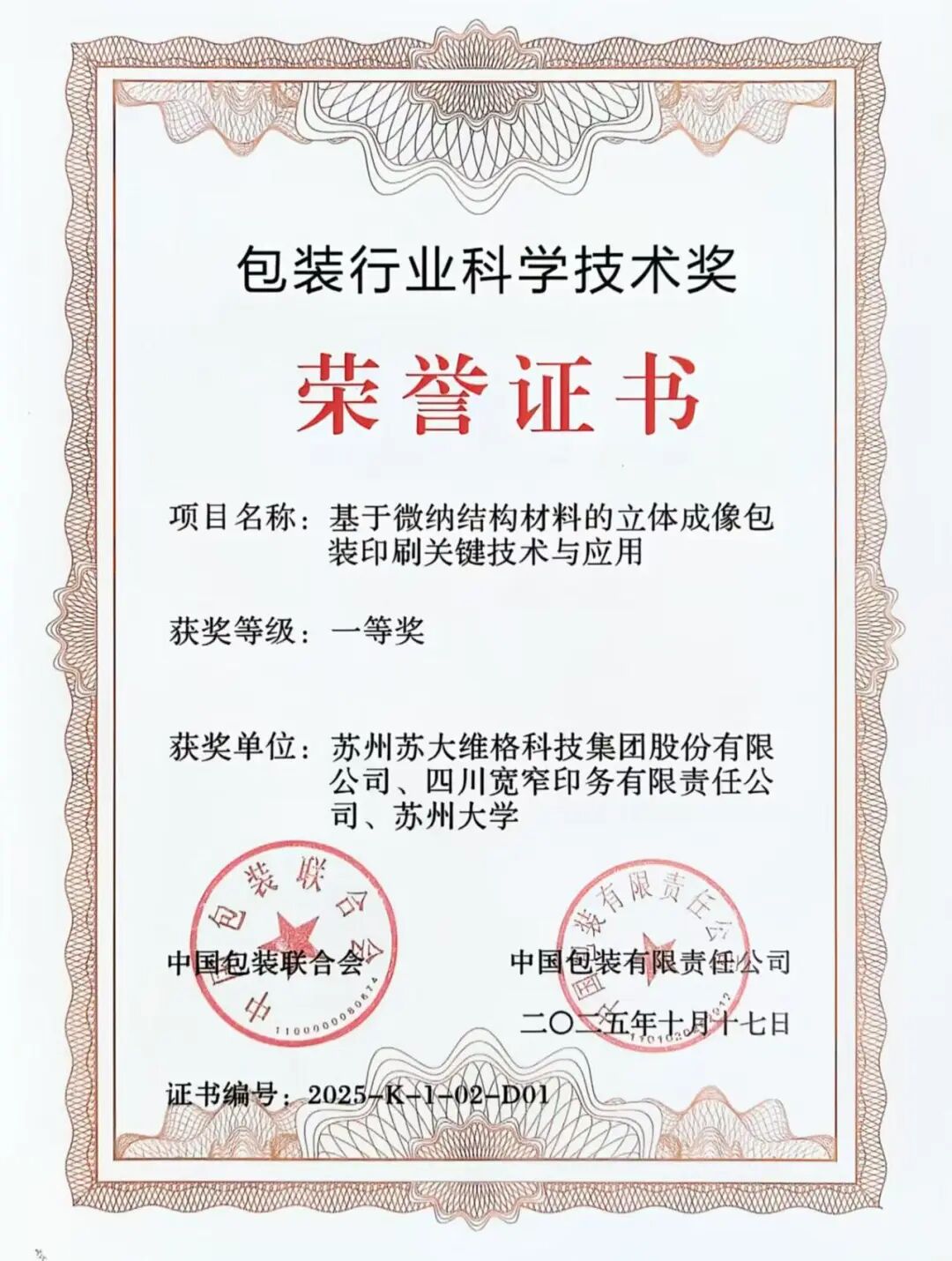 近日,中国包装联合会与中国包装有限责任公司正式公布2025年度包装行业科学技术奖授奖决定。经评审委员会评审、管理委员会审定,由苏州苏大维格科技集团股份有限公司联合四川宽窄印务有限责任公司、苏州大学共同完成的 “基于微纳结构材料的立体成像包装印刷关键技术与应用” 项目,成功斩获科学技术奖一等奖,这是行业对该项目技术创新价值与产业应用成效的高度认可。