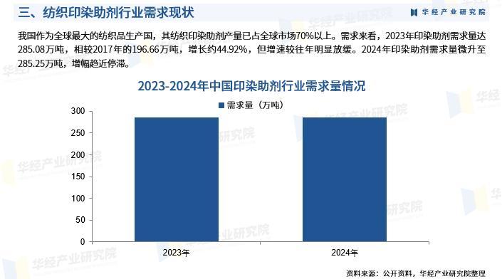 我国作为全球最大的纺织品生产国,其纺织印染助剂产量已占全球市场70%以上。需求来看,2023年印染助剂需求量达285.08万吨,相较2017年的196.66万吨,增长约44.92%,但增速较往年明显放缓。2024年印染助剂需求量微升至285.25万吨,增幅趋近停滞。