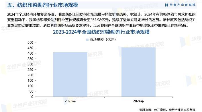 2024年全球经济环境复杂多变,我国纺织印染助剂市场规模呈持续扩张态势。据统计,2024年在价格趋稳与需求扩张的双重驱动下,我国纺织印染助剂行业整体规模增长至454.98亿元,延续了近年来稳定增长的态势。增长原因包括纺织工业发展带动需求增加、消费者对纺织品品质要求提升,以及我国在全球纺织产业链中地位巩固带来的出口市场拓展。