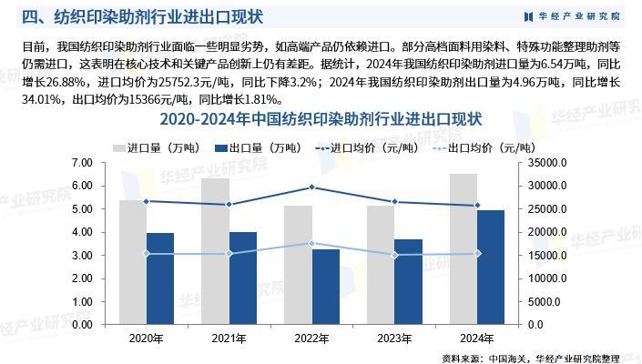 目前,我国纺织印染助剂行业面临一些明显劣势,如高端产品仍依赖进口。部分高档面料用染料、特殊功能整理助剂等仍需进口,这表明在核心技术和关键产品创新上仍有差距。据统计,2024年我国纺织印染助剂进口量为6.54万吨,同比增长26.88%,进口均价为25752.3元/吨,同比下降3.2%;2024年我国纺织印染助剂出口量为4.96万吨,同比增长34.01%,出口均价为15366元/吨,同比增长1.81%。