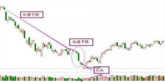 形态特征:大盘或是个股在经历长时间的下跌之后,会突发的出现下跌加速,而后成交量则连续的增长,这时候就是大胆买进的时机。