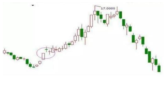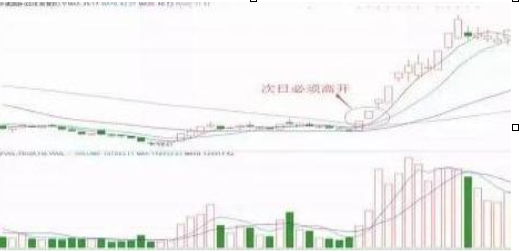 形态特征:当个股在经历长期下调之后,在回升的之后放量出现一根大阳线,之后连续出现三个不断向上的小阳线或是十字星,这表示后市的上涨可能很大,可以立即买进。