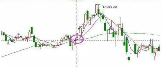形态特征:个股在大幅下调之后,反弹拉升然后出现缩量回踩,这时候如果5日均线和10日均线以及40日均线出现三线汇聚,形成金叉,出现再次上攻的迹象,那么就是大胆买进的时候。