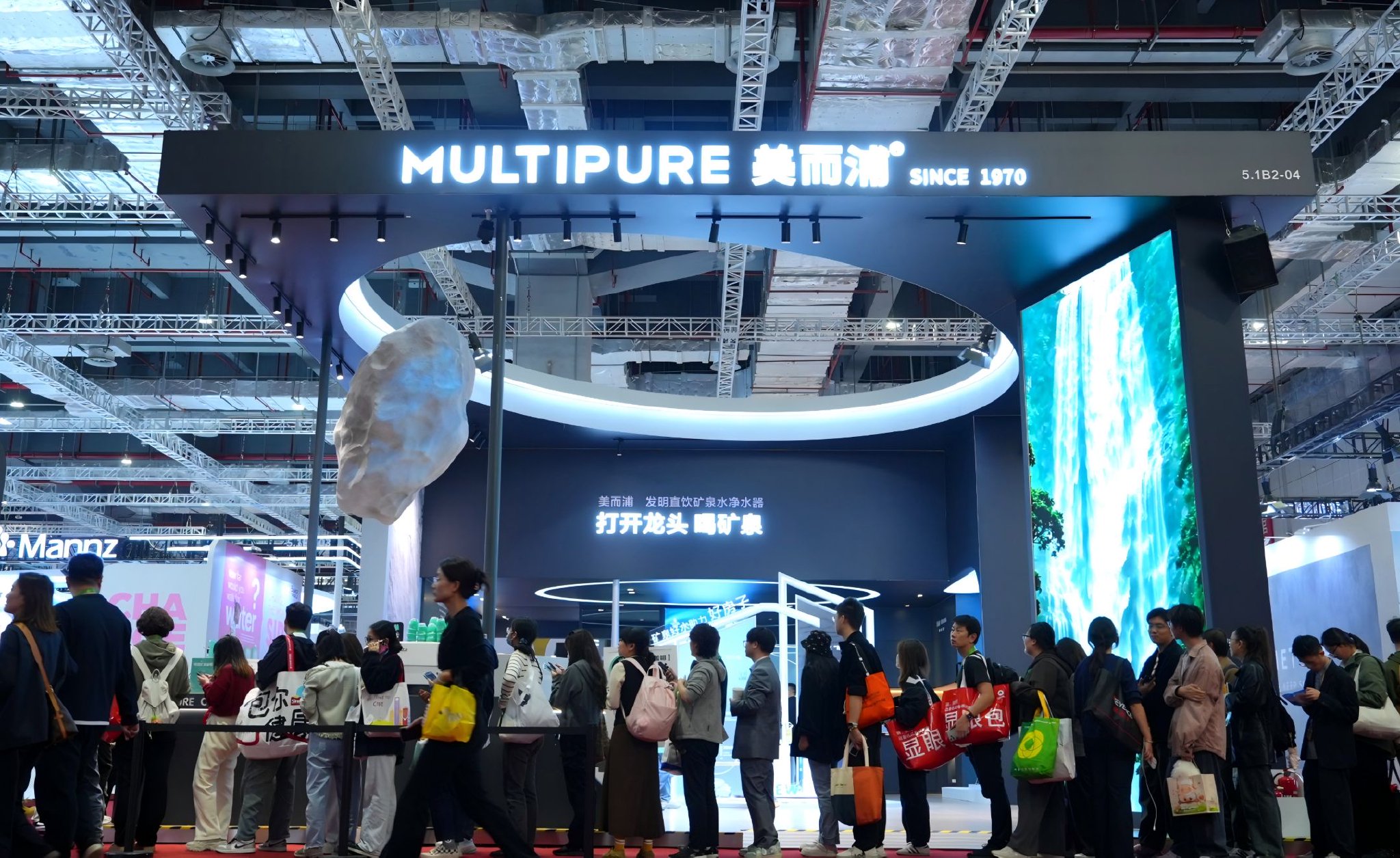 连续7年打卡进博会的MULTIPURE美而浦,今年在消费品展区5.1馆玩出了新花样——带着“矿泉好水助力好房子”的主题亮相,一套管路就能搞定全屋喝、洗、用的矿泉需求,不用区分净水和软水。