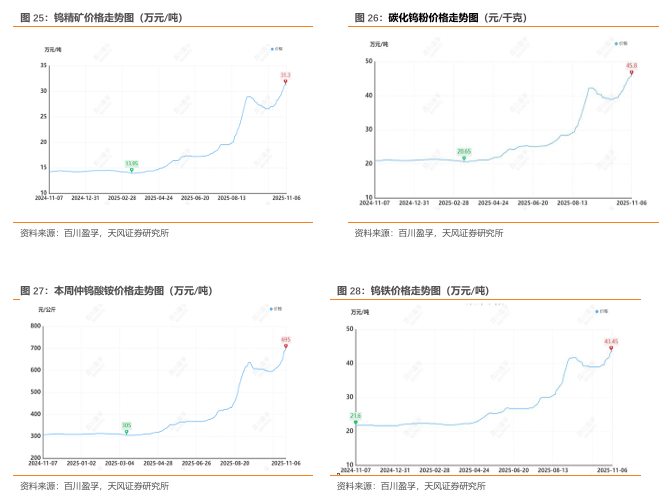 综述:本周(2025.10.31-2025.11.6)钨价上涨。截止到11月6日,65度黑钨精矿均价在31.3万元/吨,较上周上调1.5万元/吨;仲钨酸铵在45.8万元/吨,较上周上调1.9万元/吨,70钨铁均价在41.95万元/吨,较上周上调1.8万元/吨,碳化钨粉在695元/千克,较上周上调57元/千克。周内钨价持续上行,持货商挺市意愿强烈,当前供应端惜售情绪明显,对外报价较为混乱,消费端承接能力不足,上下游心里价差明显,库存消化周期拉长。价格不断突破高位且企业报价仍在冲高,整体市场低价货源相对较为难寻,但在价格的快速拉涨态势下,终端需求市场仍需一定时间消化,实单高价成交有待跟进。目前补货多为刚需,整体交易总量暂未放大,市场交易活跃度有限。