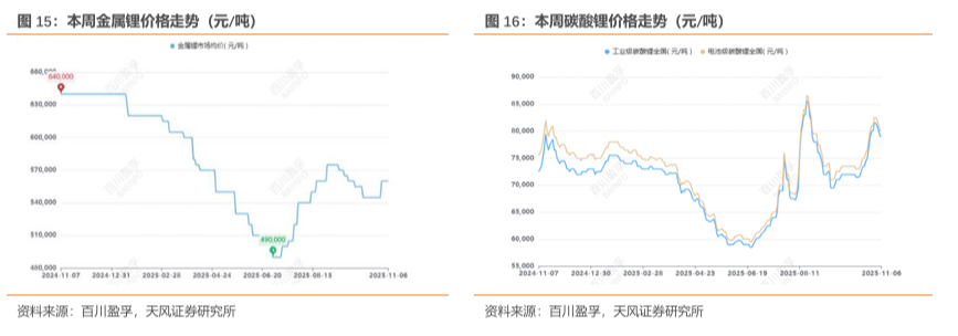 综述:本周(2025.10.31-2025.11.06)碳酸锂价格下跌,下游刚需采购。截止到11月6日,国内工业级碳酸锂(99.0%为主)市场成交价格区间在7.8-8万元/吨,市场均价7.9万元/吨,较上周价格跌3.07%;国内电池级碳酸锂(99.5%)市场成交价格区间在7.9-8.1万元/吨,市场均价为8万元/吨,较上周价格跌3.03%。本周碳酸锂期货价格回落,现货价格跟随下跌。现货市场成交略有转好,下游低位刚需采购以及后点价结算较多。期现商报价基差走弱,除部分大厂新货维持升水,多数贴水报价,部分老货出现800-1000元贴水,基差走弱主因月差拉大,以及部分持货商出货意愿增强,现货流通量增多。厂家散单出货意愿下降,维持长协及预售订单。