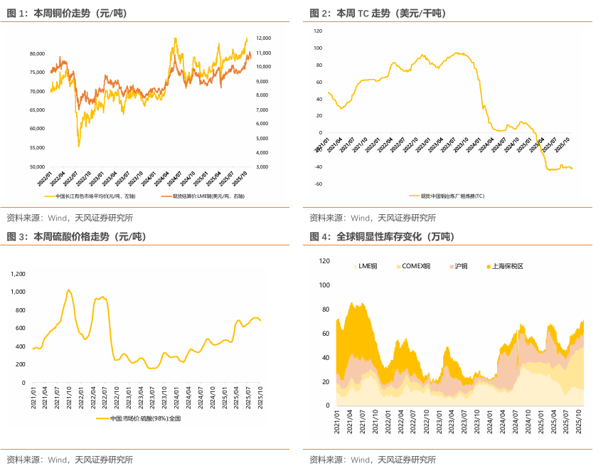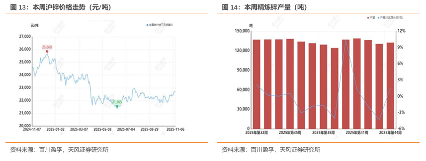 综述:本周(2025.10.31-2025.11.6)锌价冲高回落。截止2025年11月6日,0#锌锭现货周均价22428元/吨,较上周同期上涨187元/吨,涨幅为0.84%。美国政府停摆已刷新历史最长纪录,导致用于判断美国经济走向的权威数据缺位。不过,10月ADP就业报告释放出劳动力市场稳健的信号,有效缓解了市场对就业疲软的担忧。矿冶领域博弈持续,TC(加工费)落地进程受阻,其均值较10月或下调900元/金属吨,冶炼厂生产利润面临压力,多数厂商计划在11月减产。尽管新有新投产厂家带来较大增量,但受其产品流入北方市场时间较晚的影响,11月内锭供应仍需按收紧态势看待。海外市场方面,LME(伦敦金属交易所)锌库存再度刷新低位,在多头资金主导下,国内外锌价周内呈现偏强运行格局。