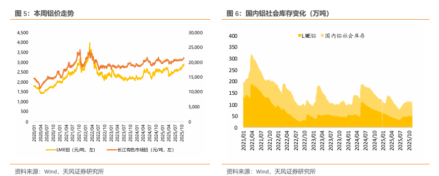 市场综述:本周(2025.10.31-2025.11.6)铝价上涨。本周外盘铝均价为2876美元/吨,较上周相比上涨3美元/吨,涨幅0.10%。沪铝主力均价21493元/吨,较上周相比上涨240元/吨,涨幅1.13%。华东现货均价为21364元/吨,与上周相比上涨204元/吨,涨幅0.96%。华南现货均价为21228元/吨,与上周相比上涨168元/吨,涨幅0.80%。中国与美国贸易关系好转,并与各国保持良好往来,叠加十五五会议精神持续作用,宏观情绪较好,现货铝价上涨。