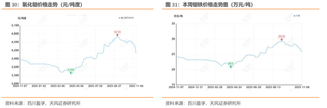 综述:本周(2025.10.31-2025.11.06)价格快速回落,行情偏空承压。截至本周四,中国45-50度钼精矿今日均价为4015元/吨度,较上周均价下调6.52%;氧化钼今日均价为4120元/吨度,较上周均价下调6.36%;钼铁今日均价为25.8万元/基吨,较上周均价下调4.09%;一级四钼酸铵今日均价为24.9万元/吨,较上周均价下调3.11%:一级钼粉今日均价为47.5万元/吨,较上周均价下调2.06%。本周钼市行情快速走弱。主流钢厂先后进场招标,然开标价格跌落26万元关口,市场担忧恐慌情绪升温,而原料端市场因货源流通停滞,价格调整偏慢,市场倒挂风险形势愈加严峻,行情不断承压走弱。虽钢招价格降至25.65万元/基吨,但代表性成交出现,行情走势相对清晰,同时进口氧化钼价格重心暂稳于24美元附近,且场内偏空氛围笼罩,原料端价格大幅下滑,进口优势不再明显,倒挂风险或有些许缓解,市场或迎来阶段性趋稳。可钢招价格仍不断下探,市场局势并未改变,加之散货市场询盘冷清,实际可操作空间有限,业者多暂停对外报价,行情承压加剧,基本面矛盾依旧凸显。