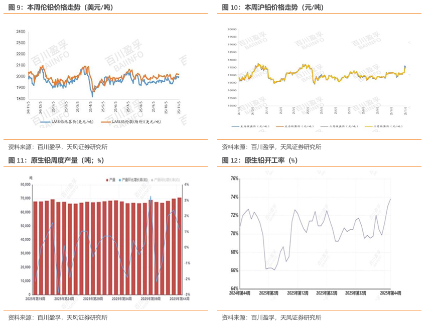 综述:本周(2025.10.31-2025.11.6)铅价震荡整理,整体均价有所上涨。截至本周三(11月5日),LmeS_铅3M一周结算均价1995美元/吨,较上周均价上涨12美元/吨,涨幅为0.60%。截至本周四(11月6日),沪铅主力一周结算均价17439元/吨,较上周均价上涨1元/吨,涨幅为0.01%。百川盈孚1#铅锭指导价一周均价17250元/吨,较上周均价上涨15元/吨,涨幅为0.09%。宏观层面,美国政府停摆引发了市场对资金流动性的深层忧虑,与此同时,美国经济数据的强劲表现使得市场“鹰派”声音再度高涨,导致市场对美联储降息的预期急剧降温。供应端原再生铅炼企复产进度逐步推进,铅锭供应逐渐增加,需求端来看,下游蓄电池企业消费力度转弱采购积极性不高,多以按需采购为主,市场整体成交氛围较为清淡。