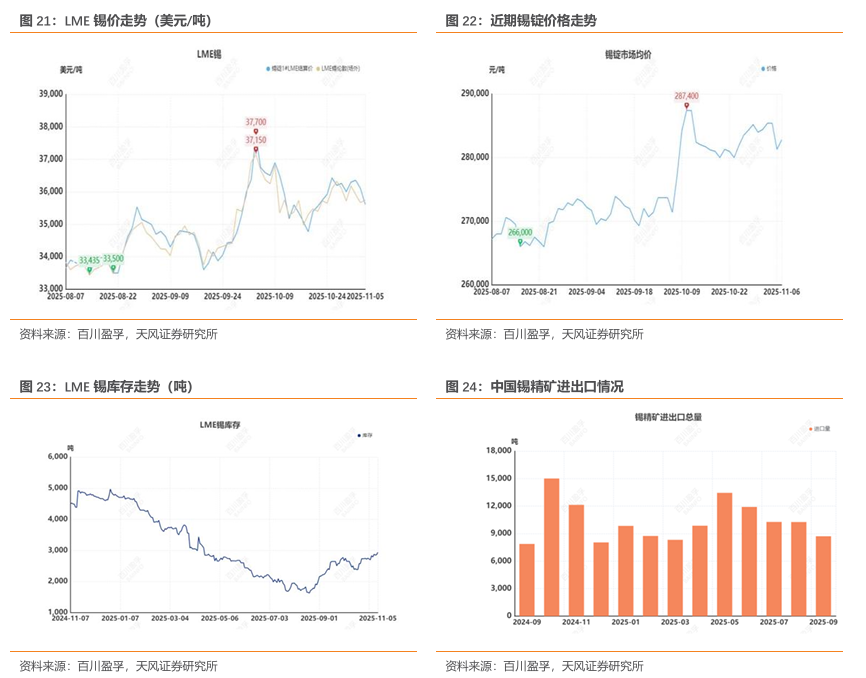 综述:本周(2025.10.31-2025.11.06)锡价震荡下行。截至11月5日收盘,伦锡收盘35745美元/吨,较上周同期收盘价相比下跌390美元/吨,跌幅为1%。本周宏观面表现利空,强动的美元和疲软的制造业数据对锡价持续施压;但中美贸易关系的局部缓和与矿端供应偏紧,也限制了价格进一步大跌的空间:同时国际库存处于低位,伦锡走势震荡偏弱:国内锡市场供需疲软,供应增量有限,需求端表现一般,下游畏高情绪较浓,谨慎观望为主,锡价震荡下调。