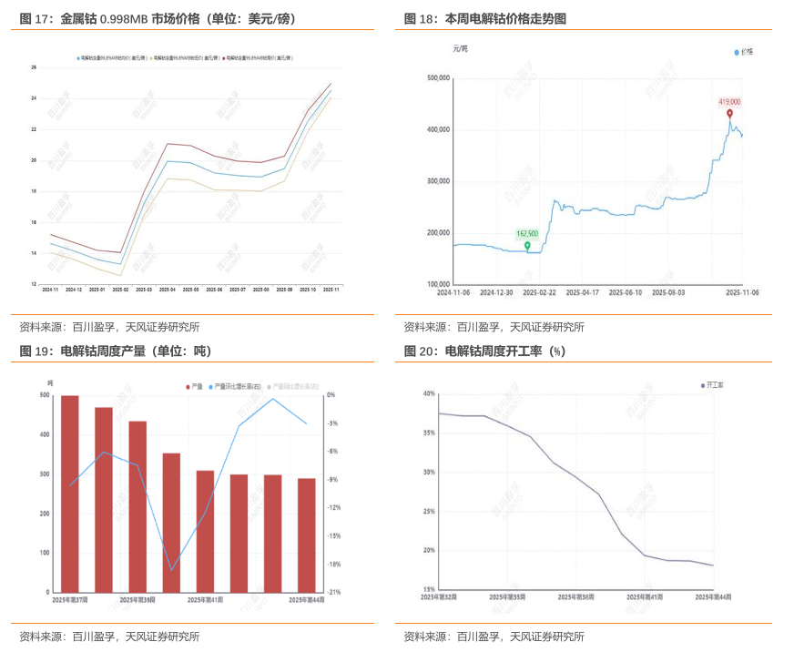 电解钴综述:本周(2025.10.31-2025.11.06)国内金属钻行情震荡下跌,截至本周四,百川盈孚统计99.8%电解钴价格37.7-41.0万元/吨,均价为39.35万元/吨,较上周同期下调1.4万元/吨,跌幅3.44%。本周电解钴盘面接连下滑,今日小幅回升,厂家在成本压力下普遍暂停报价,报价贸易商随盘调整为主,下游维持刚需采买节奏,整体成交未现明显放量。
