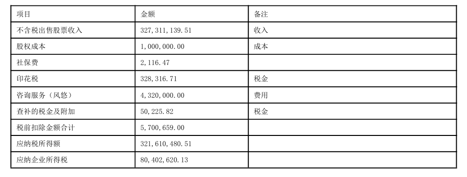 你公司2020年减持“优博讯”股票17,955,000股,取得不含增值税收入327,311,139.51元。下列事项应予以税前扣除:股权的初始投资成本1,000,000元;证券交易印花税328,316.71元;支付给深圳风悠咨询有限公司的咨询服务费4,320,000.00元;支付社保费2,116.47元;2020年应缴纳的城市维护建设税25,112.90 元、教育费附加 15,067.75 元、地方教育费附加10,045.17 元。综上,税前扣除金额共计5,700,659.00元,应纳税所得额321,610,480.51 元,适用税率25%,应缴、未缴企业所得税80,402,620.13 元。详见下表。