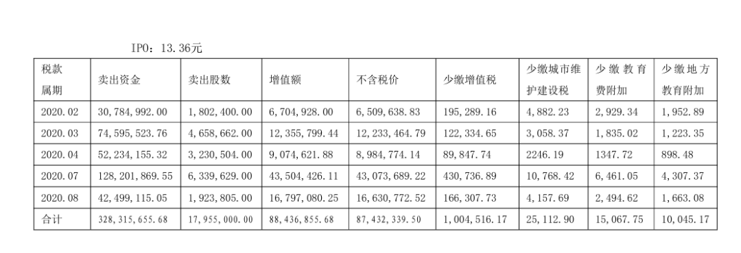 (1)2020年2月至8月你公司出售17,955,000股“优博讯”股票,卖出资金328,315,655.68元,IPO价13.36元/股,含税增值额88,436,855.68 元, 不含税增值额87,432,339.50元,少缴增值税1,004,516.17元、城市维护建设税25,112.90元、教育费附加15,067.75元、地方教育费附加10,045.17元。详见下表: