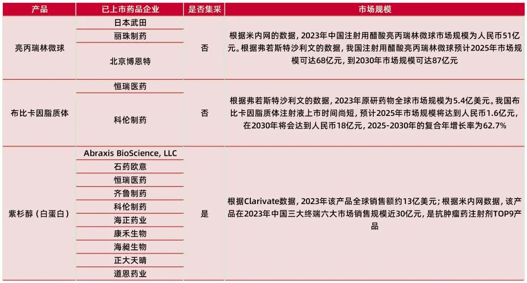 表2:亮丙瑞林微球、布比卡因脂质体、紫杉醇(白蛋白)管线市场情况
