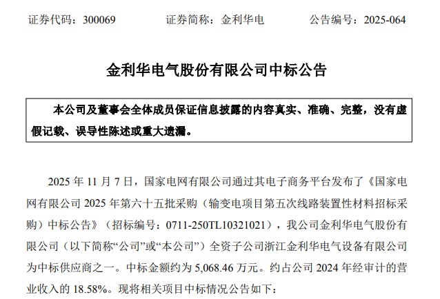 山西A股上市公司金利华电(300069.SZ)11月7日发布重磅公告,公司全资子公司浙江金利华电气设备有限公司成功中标国家电网有限公司2025年第六十五批采购项目,中标金额约5068.46万元。