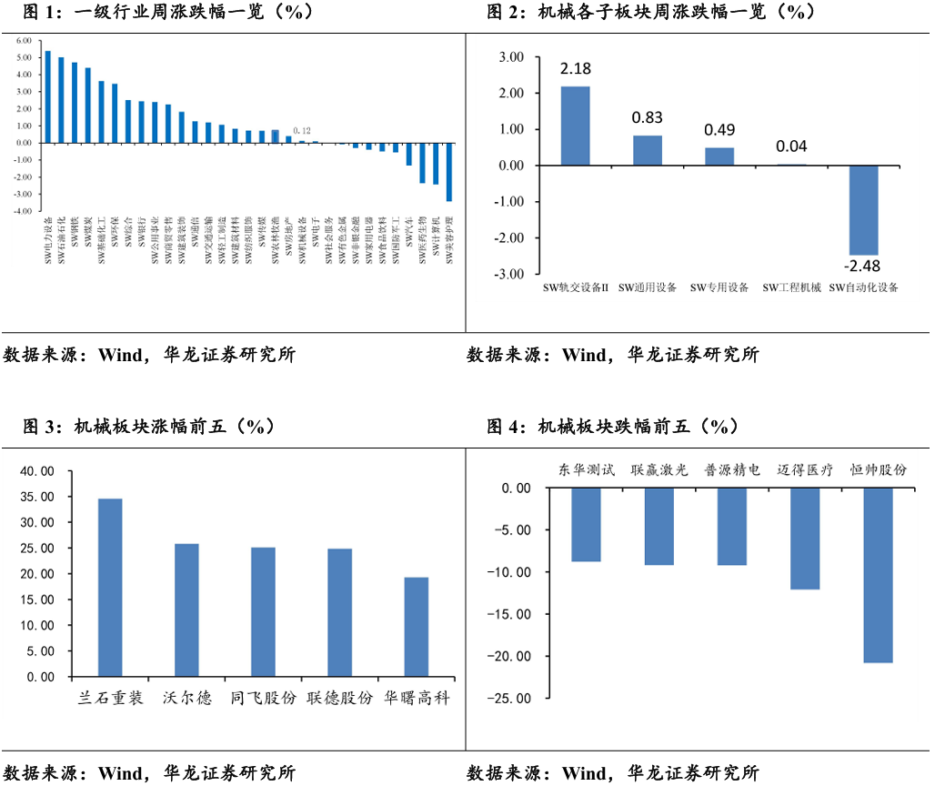 重点覆盖个股中,涨幅前五的公司分别为兰石重装(+34.56%)、沃 尔德(+25.79%)、同飞股份(+25.09%)、联德股份(+24.86%)、华曙 高科(+19.27%),主要与核聚变、数据中心散热等概念相关;跌幅前五 的公司分别为恒帅股份(-20.81%)、迈得医疗(-12.11%)、普源精电(-9.23%)、联赢激光(-9.21%)、东华测试(-8.78%)。