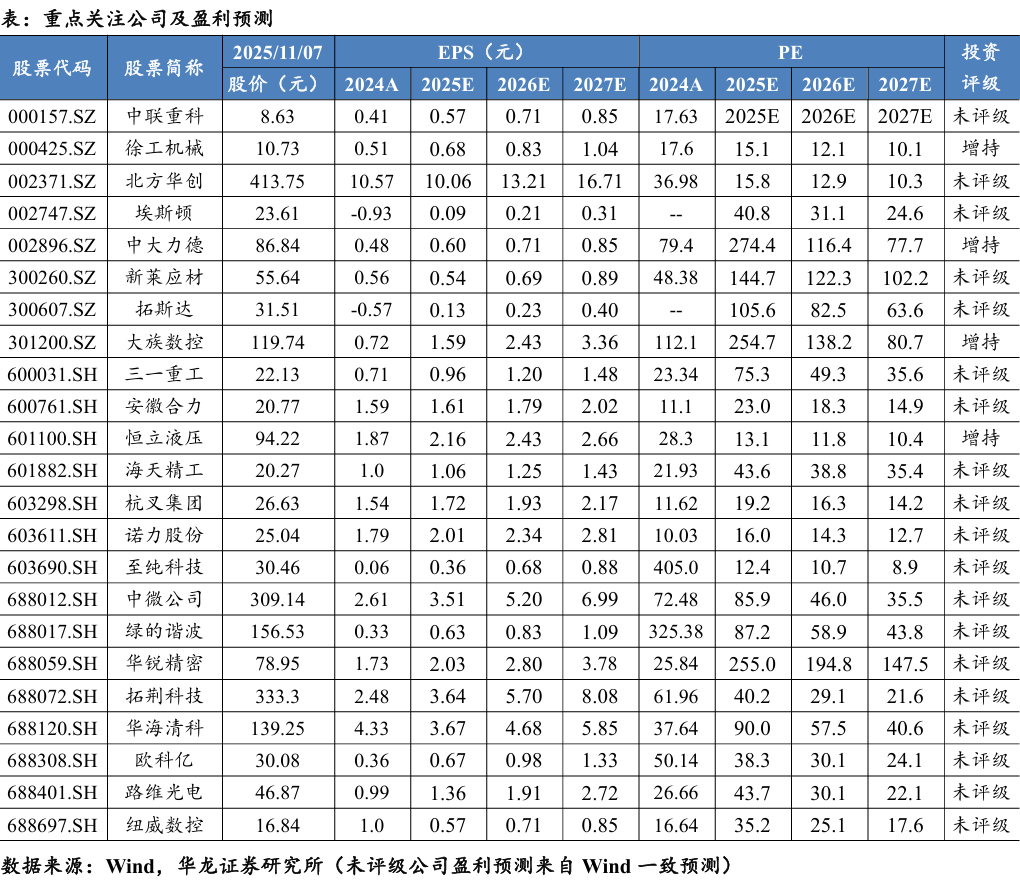 “十五五”点名工业母机,政策驱动下国产机床高端化进程有望加快。2025年10月28日,《中共中央关于制定国民经济和社会 发展第十五个五年规划的建议》公布。建议提出,加强原始创新和关键核心技术攻关。完善新型举国体制,采取超常规措施,全链条推动集成电路、工业母机、高端仪器等重点领域关键核心技 术攻关取得决定性突破。政策驱动下,国内高端制造领域对高精度、高稳定性、高复合化的五轴机床、数控铣床、车铣复合中心等需求将有望增加。具备高端产品研发能力和核心部件自研能力的公司值得关注。建议关注:纽威数控(688697.SH)、大族数控(301200.SZ)、海天精工(601882.SH)等。