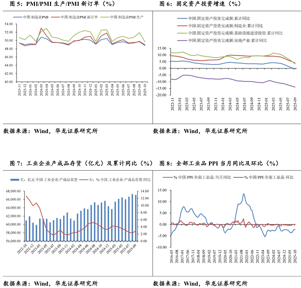 截至2025年9月,固定资产投资完成额累计值同比下降0.5%,其中制造业投资同比增加4%,基建投资同比增加3.34%,房地产投资完成额同 比下降14%。