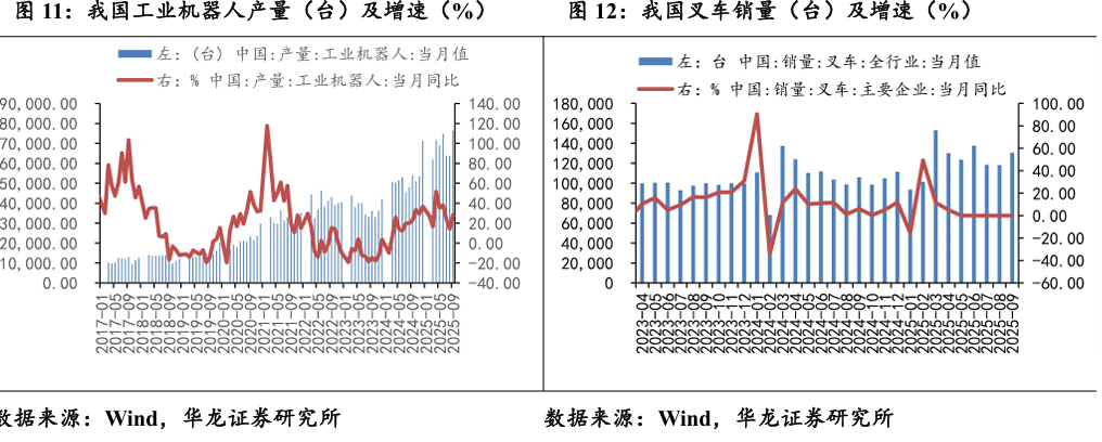 2025年9月,我国工业机器人产量76287台,同比增加28.3%;2025 年9月,我国叉车销量130380台,同比增加23%。
