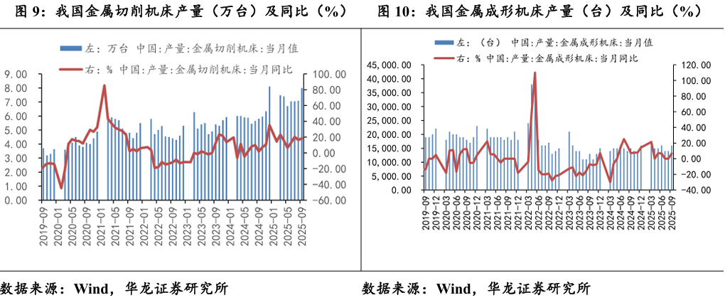 2025年9月,金属切削机床产量7.77万台,同比增加18.2%,连续十 五个月保持正增长;2025年9月金属成形机床产量1.6万台,同比增长6.7%。