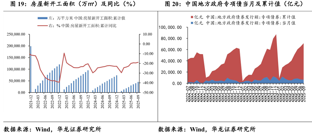 2025年9月,我国房地产新开工面积累计45399.32万平方米,同比下 降18.9%;2025年9月地方政府专项债当月发行6359亿元,1-9月份累计 发行64900亿元,同比增长29.27%。