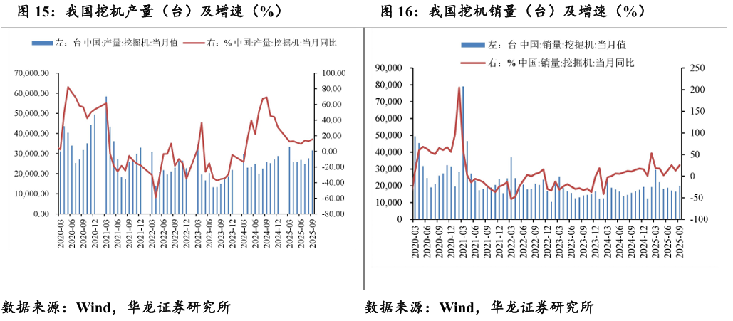 2025年9月,我国共生产挖掘机31608台,同比增长15.3%;2025年 9月共销售挖掘机19858台,同比增长25.4%。2025年挖机销量快速增长, 行业复苏明显。