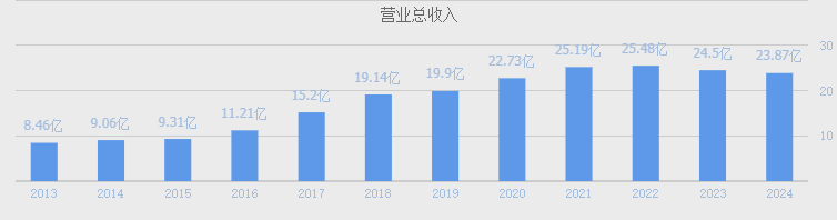 近几年公司营收保持在24亿左右,净利润保持在8亿左右。