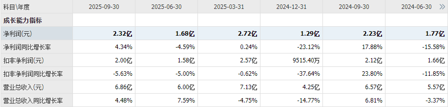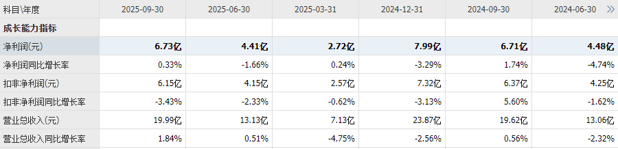2025年10月24日涪陵榨菜公布了今年三季报业绩:营收19.99亿同比小幅增长1.84%,净利润6.73亿同比小幅增长0.33%,扣非净利润6.15亿同比小幅下降3.43%;其中第三季度营收6.86亿同比增长4.48%,净利润2.32亿同比增长4.34%,扣非净利润2亿同比下降5.63%;