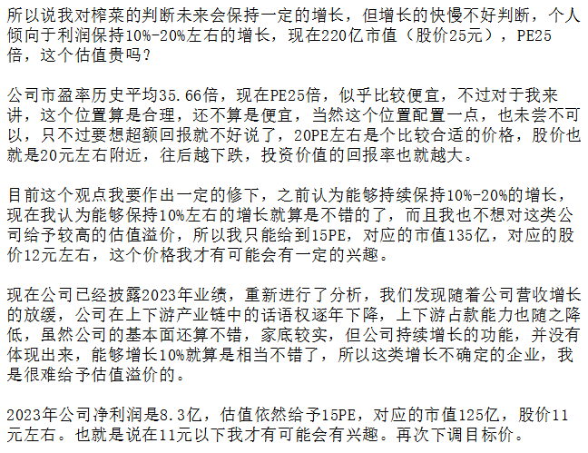 过去我对榨菜的增长预期10-20%左右,然后2023年再次下调能够增长10%左右就算很不错,结果发现公司的增长动能远远不及预期,现在最新的判断是,能够增长5%也很不错,毕竟在当下低迷的宏观环境,低迷的消费环境,再叠加公司资产负债表没有以前那么坚硬(应收账款大幅增长,合同负债大幅下降),管理层的失误(36.8亿的绿色智能化生产基地),管理层回报投资者力度不足(大量的现金,现金分红率不高),等等方面考虑,在估值方面,我只能给予10-15倍PE估值,最多是15倍PE。